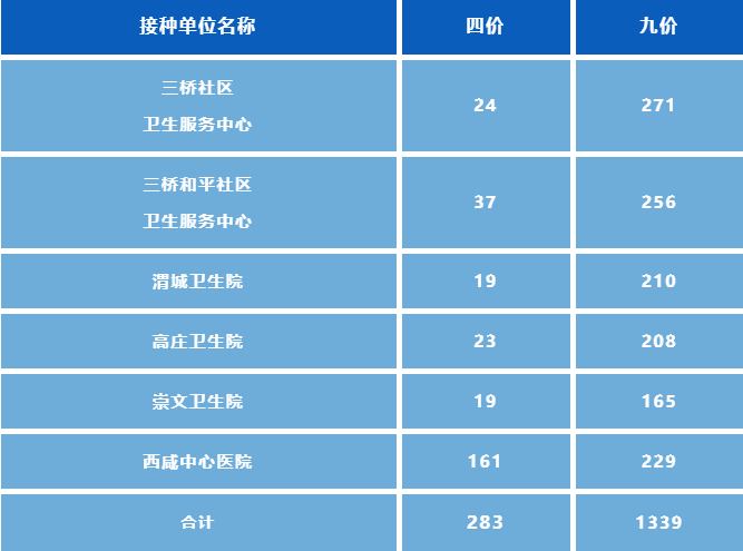 本次西咸新区开放六个接种门诊(三桥社区卫生服务中心、三桥和平社区卫生服务中心、崇文卫生院、渭城卫生院、陕西中医药大学第二附属医院(西咸新区中心医院)、高庄卫生院)号源,接种日期:7月21日至8月19日共30天,六个接种门诊支持四价HPV疫苗预约283人,九价HPV疫苗预约1339人,数量有限,约完为止。预约成功,系统提示的同时,名单将于接种日在接种单位进行公示。