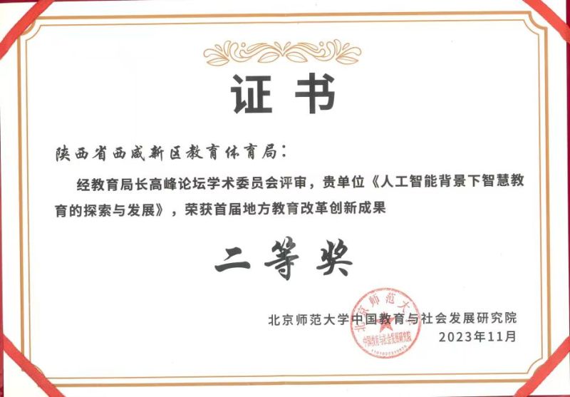 获批教育部资源发展中心“央馆人工智能”规模化试点区,被陕西省教育厅授予“陕西省智慧教育示范区”,先后培育省市智慧校园25所。完成省级教育信息化重点课题35项,西咸智慧教育改革案例获评首届地方教育改革创新成果全国二等奖,建设经验入选教育部信息化管理中心《中国智慧教育发展报告》。