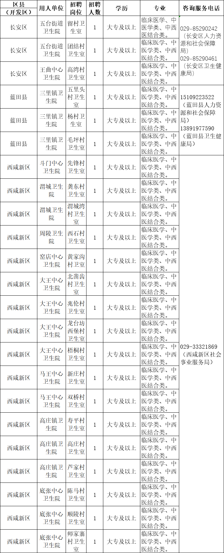 西安市大学生乡村医生专项招聘岗位信息表
