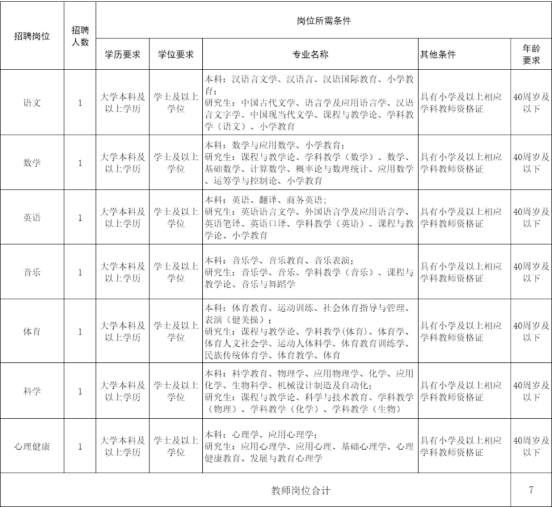 小学语文:5人、小学数学:3人、小学英语:2人、小学体育:1人、小学音乐:1人、小学美术:2人、小学道德与法治:1人 、小学信息技术:1人、财务:1人。