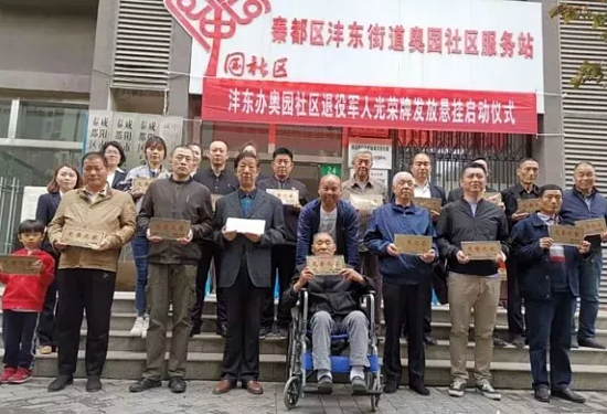 4月9日上午,西咸新区沣东新城沣东街道奥园社区举行为烈属、军属和退役军人家庭发放并悬挂“光荣之家”荣誉牌启动仪式,辖区30多名退役军人参加启动仪式。