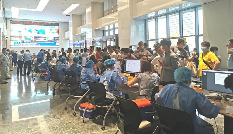 6月5日下午,西咸新区公共资源交易中心创新大厦一楼大厅临时接种点,身着蓝色防护服的医务人员熟练地为前来接种的群众录入信息、注射疫苗。