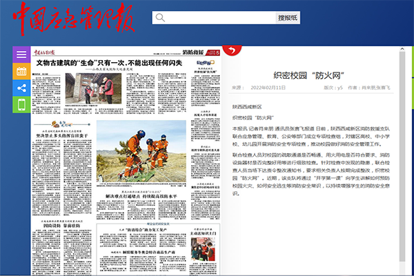 2月11日,中国应急管理报消防救援版报道西咸新区织密校园“防火网”,报道指出,自2月7日起,西咸新区消防救援支队联合新区应急管理局、教育卫体局、公安局等职能部门成立7个专项检查组,对辖区5所高等院校,391所中小学(含幼儿园),11所寄宿院校开展消防安全专项检查,确保春季复课安全有序。
