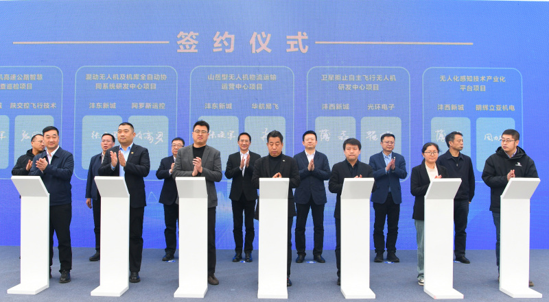 随后,在热烈的掌声中,18个项目集中签约,在这些项目里,11个产业项目总金额27亿元。其中,秦汉新城、空港新城、泾河新城、能源金贸区、沣西新城、沣东新城、西咸轨道公司分别与咸阳兴渭建设开发有限公司、陕西新航科训科技有限公司、陕西八方飞行控制设备有限公司、卡斯柯信号有限公司、陕西交控飞行技术有限公司、西安光环电子科技有限公司、西北工业大学民航学院等签署合作协议,将围绕无人机上下游产业链,在无人机研发、生产、制造、试验、应用、售后培训等方面开展深入合作。