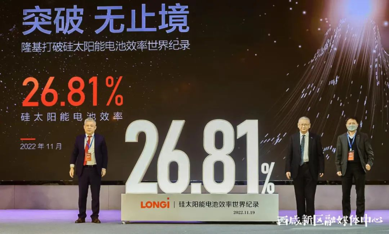 作为西咸新区入区“明星”企业,隆基绿能在开幕式上发布了硅太阳能电池效率最新世界记录。据德国哈梅林太阳能研究所(ISFH)的最新认证报告,隆基绿能自主研发的硅异质结电池转换效率达到26.81%。“世界太阳能之父”、新南威尔士大学教授马丁·格林表示,隆基绿能该26.81%的电池效率是目前全球硅基太阳能电池效率的最高纪录,也是光伏史上第一次由中国太阳能科技企业创造的硅电池效率世界纪录。据介绍,隆基绿能高效晶硅异质结电池研发团队从2021年6月至今,不断打破并刷新原先的硅异质结电池转换效率的世界纪录,从25.26%提升到26.81%,实现了一年零四个月内绝对值增加了1.55%的奇迹。尤其是在一个多月时间内,隆基绿能就分别以26.74%、26.78%、26.81%“连中三元”,刷新硅太阳能电池效率新纪录。