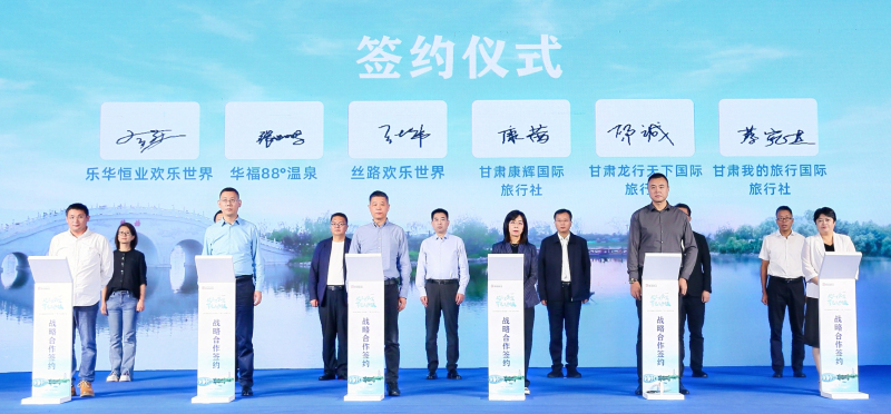 在签约环节,茯茶镇、昆明池、诗经里、乐华恒业欢乐世界、华福88度温泉乐园、丝路欢乐世界六大景区分别与甘肃中信国际旅行社、甘肃保利国际旅行社、甘肃金凤国际旅行社、甘肃康辉国际旅行社、甘肃龙行天下国际旅行社、甘肃我的旅行国际旅行社签署战略合作协议,将围绕两地文旅进行深入合作。