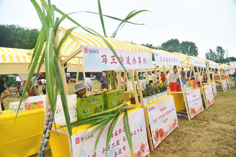 活动现场还特别设置了农特产品展示区,新区农业龙头企业和各镇街近30家合作社、涉农企业,带着近百种特色农特产品进行集中展示。周陵街道的葡萄、永乐镇的板栗红薯、大王街道的香醋、高桥街道石头馍,以及水果、蔬菜、蜂蜜、酒水、粮油等农副产品琳琅满目,这个特别的“集市”吸引了园内参观群众的驻足关注。