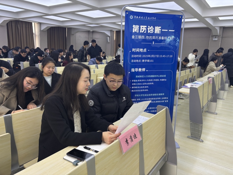 简历诊断开启职场第一扇门。2月27日下午,新区人力资源服务中心走进陕西科技大学镐京学院开展简历诊断活动。镐京学院150余名毕业生积极参与。活动现场,就业导师们热情地为同学们提供“简历诊断”服务,针对学生简历中存在的问题,为同学们提出切实可行的修改建议,助力他们明确职业方向,早日开启职业新篇章。