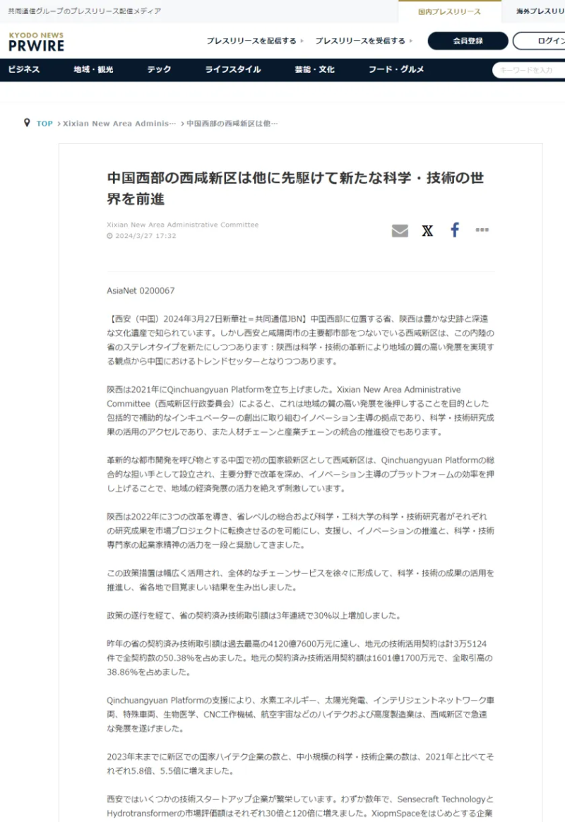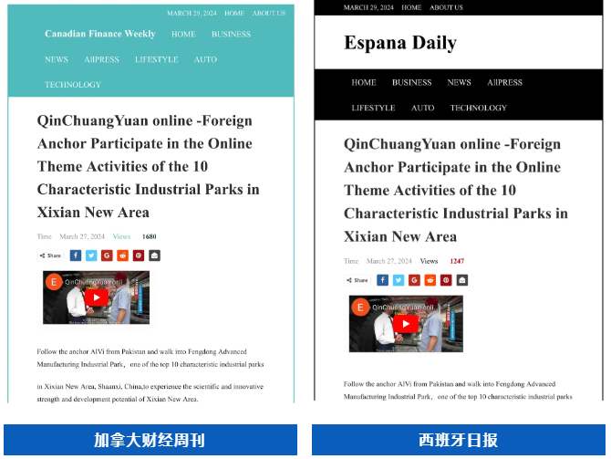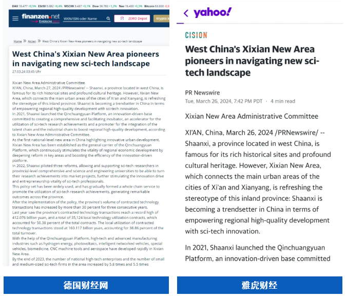 全球通讯社联盟发布文章《West China's Xixian New Area pioneers in navigating new sci-tech landscape》(中国国家级新区西咸新区竞逐科技创新“新蓝海”),被全球510家外媒转载,截至目前,总浏览量超3亿人次。