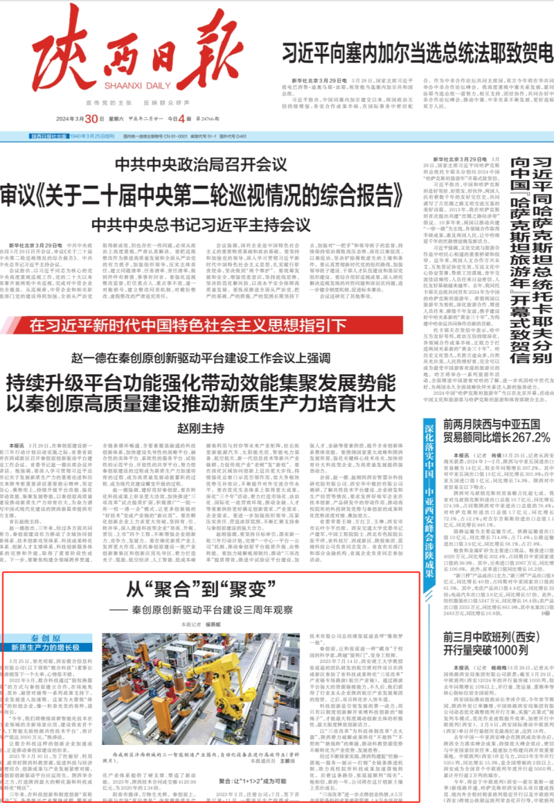 陕西日报头版刊发《从“聚合”到“聚变”——秦创原创新驱动平台建设三周年观察》