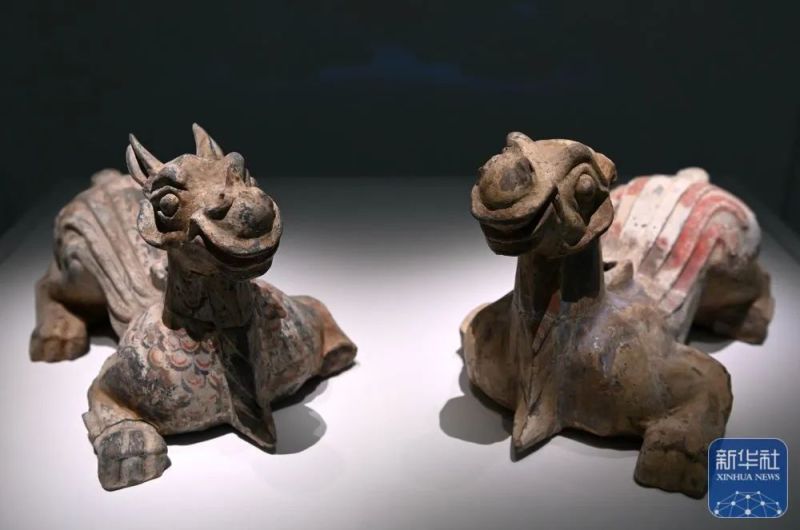 | 陕西历史博物馆秦汉馆内展出的西汉彩绘陶翼兽(5月13日摄)。|