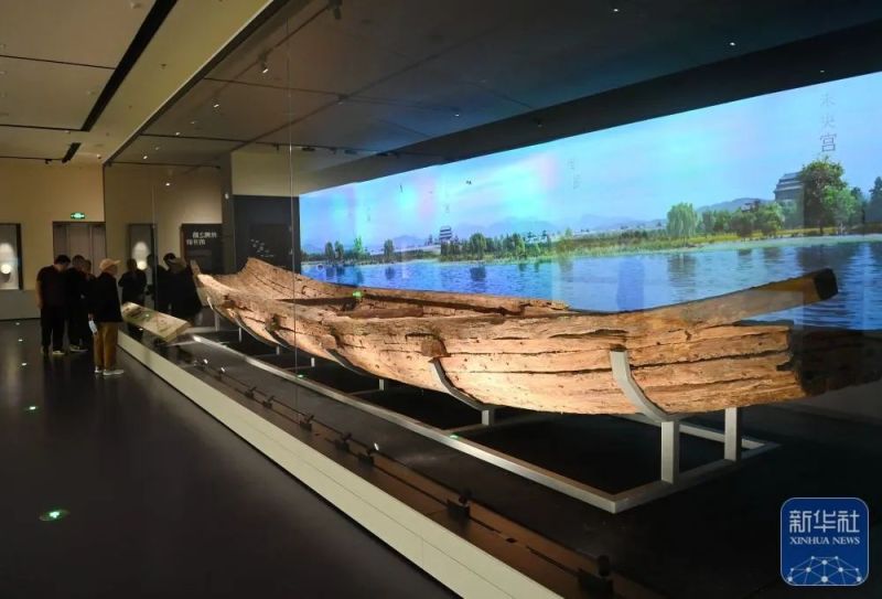 | 5月6日,观众在陕西历史博物馆秦汉馆参观文物汉代古船“丝路一号”。|