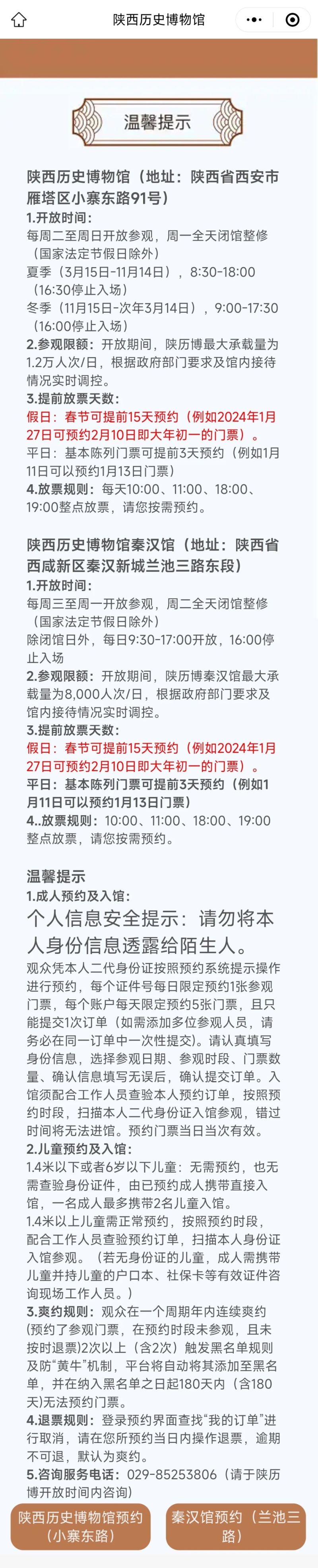 第三步:请耐心看完温馨提示内容(内容相当重要,建议在预约门票之前充分阅读了解,预约门票时直接滑动至最底端),然后点击“秦汉馆预约(兰池三路)”按钮。