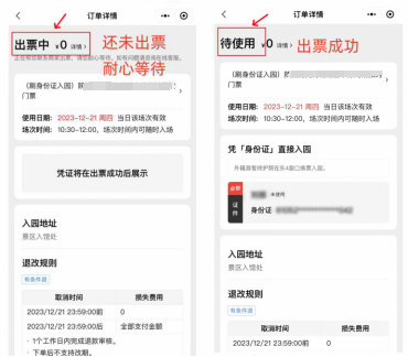 提交后,请一定注意页面情况,此时会显示“出票中”的提示,请不要着急退出界面,等屏幕显示如下图所示“待使用”界面时,方为预约成功!