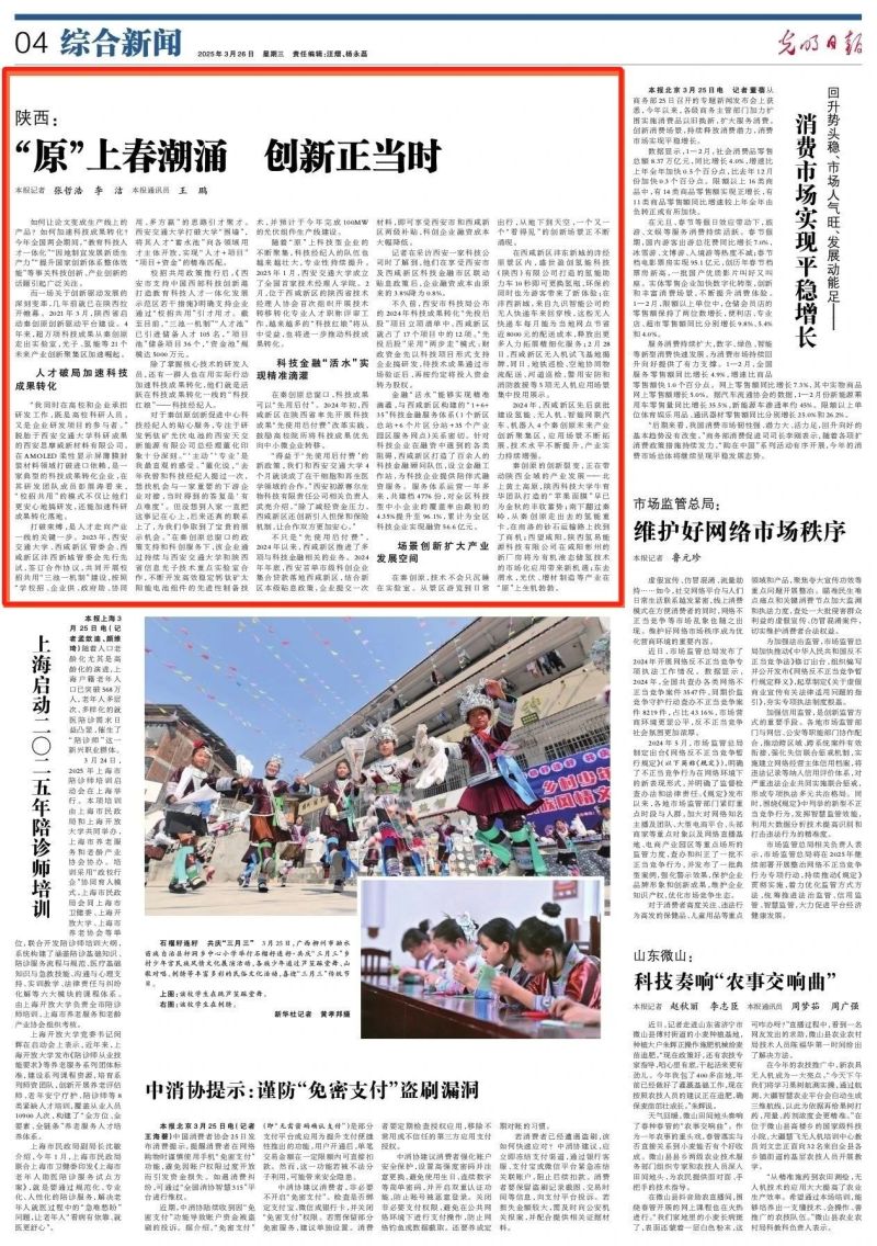 3月26日,光明日报刊发《陕西:“原”上春潮涌 创新正当时》,聚焦秦创原总窗口西咸新区持续深化科技成果转化“三项改革”,为加快培育壮大新质生产力注入强劲动能。部分内容节选如下: