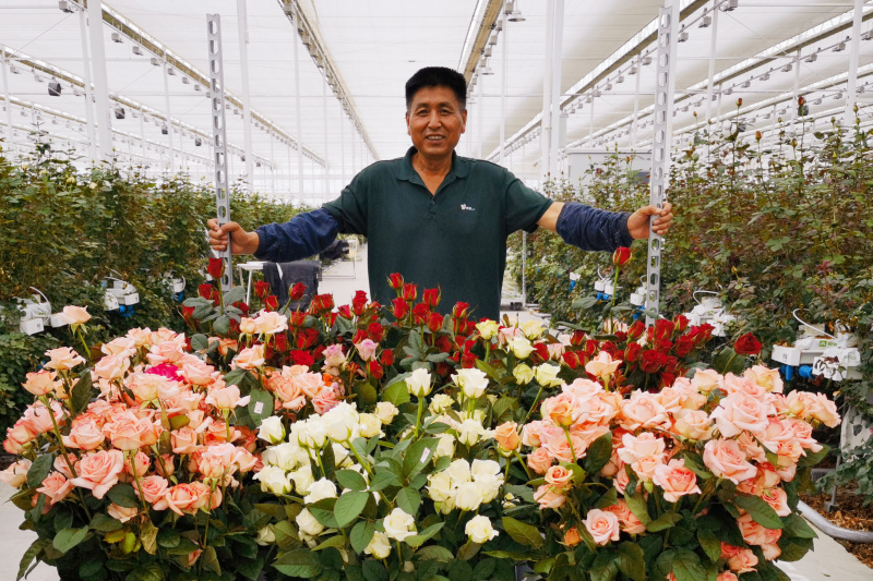 “正压温室种植玫瑰,我们在全国是独一份!”李朝阳介绍,正压温室即半封闭温室,可有效调控温室内气候环境,实现智能化生产管理和365天全季节、全天候采收。较传统模式,既能减少热能消耗、降低内部污染风险,又能提高15%-20%的产量。