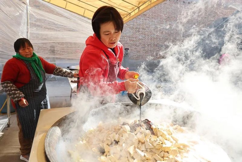 74岁的岳凤霞,是服务队里最热心的一员。她系着一条褪色的旧围裙,布满皱纹的双手握着菜刀,动作却依旧麻利。白菜、豆腐,在她手下很快变成均匀的小块,整齐地码在盆子里,为中午的大烩菜备足食材。“来这儿帮忙,心里敞亮着呢!”岳凤霞抬起头,眼角的皱纹里漾着真切的笑意,“和老姊妹们聚在一起唠唠家常,说说心里话,笑着笑着活儿就干完了。还能为村里的老伙计们出点力,咱人老心不老!”