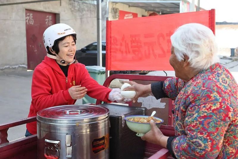 11点50分,饭菜装上车,岳阿萍的送餐准时开启。“晌午饭来咧,取碗!”停车,她快步上前接过94岁爷爷和90岁奶奶递来的碗,盛满热乎的烩菜,再稳稳地送到老人手中。跨上电动车,她又马不停蹄地赶往下一户。