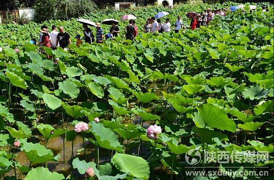 7月14日,在沣东荷苑,游人戏水赏荷。当日,位于西咸新区沣东新城斗门街道办普贤寺村的荷苑,上百亩荷塘里600多种荷花竞相绽放。翠绿的荷叶丛中,亭亭玉立的荷花像披着薄纱在湖中沐浴的仙女一样,或含笑伫立,或娇羞欲语,摇曳着曼妙的身姿,徜徉在水云间,构成一幅夏日竹风摇塘满苑荷香的美景,吸引数万名游人市民流连忘返。据了解,最近正值荷花盛开旺季,沣东荷苑周一至周五每日游客过万,双休日达到三、四万人。记者 袁景智摄