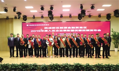 5月14日上午,能源金贸区举办2019年优秀企业表彰暨优惠政策发布会,西咸新区管委会副主任陈辉出席会议并为优秀企业颁奖,能源金贸区园办主任张建军致辞。