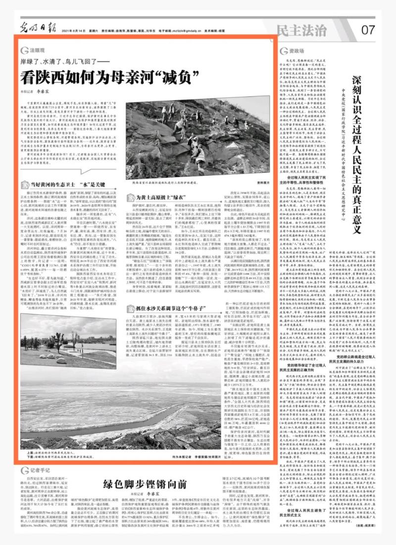 8月14日,光明日报刊发《看陕西如何为母亲河“减负”》报道西咸新区积极推进沣河治理,再现河道清水长流,两岸碧绿自然的生态新格局。