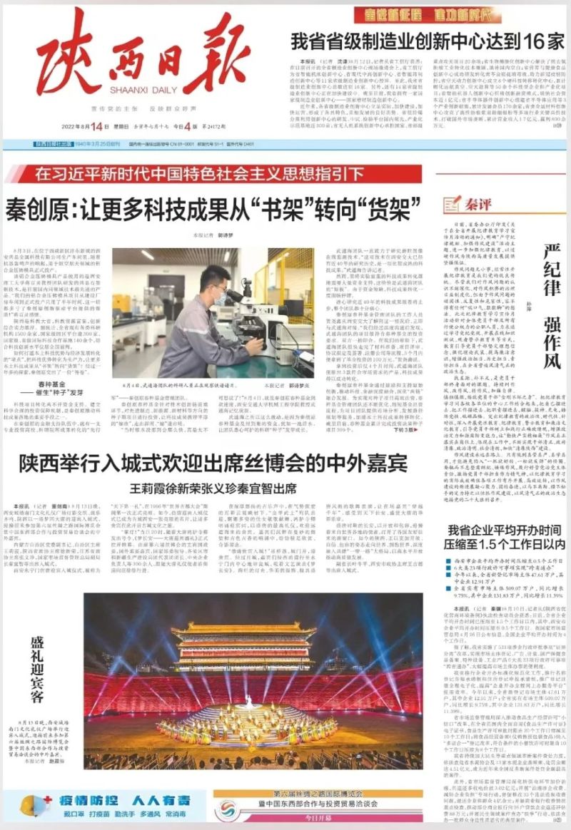 8月14日,陕西日报头版头条刊发《秦创原:让更多科技成果从“书架”转向“货架”》聚焦西咸新区持续加速“两链”融合,推动更多科技成果孵化、转化、产业化。为陕西高质量发展集聚强劲动能。