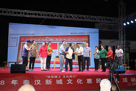 由秦汉新城党委宣传部指导创作的扶贫题材秦腔现代剧《杨毛沟》已在辖区巡演6场,扶贫舞台剧《慰问金》《刘发展脱贫记》等有温度、有力度、接地气,群众喜闻乐见舞台文艺作品受到广泛好评,以文艺的形式讴歌扶贫脱贫感人事迹,激励先进,激发贫困群众的内生动力。