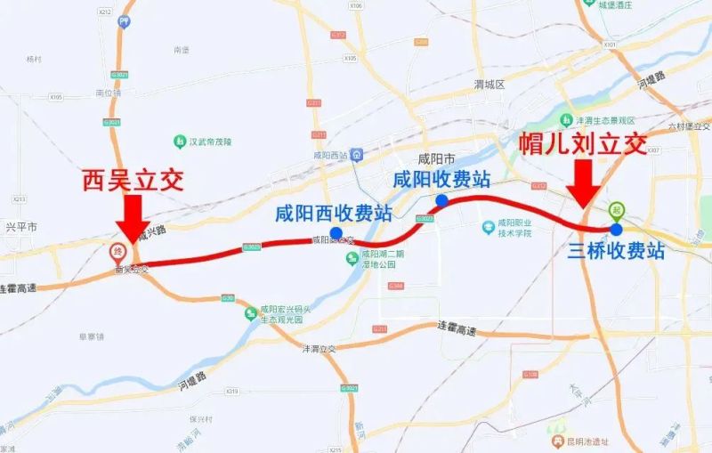 2.从咸阳经咸户路驶入G30连霍高速,从兴平收费站驶出,进入兴平市。