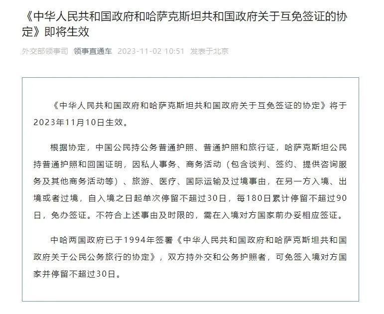 《中华人民共和国政府和哈萨克斯坦共和国政府关于互免签证的协定》将于2023年11月10日生效。
