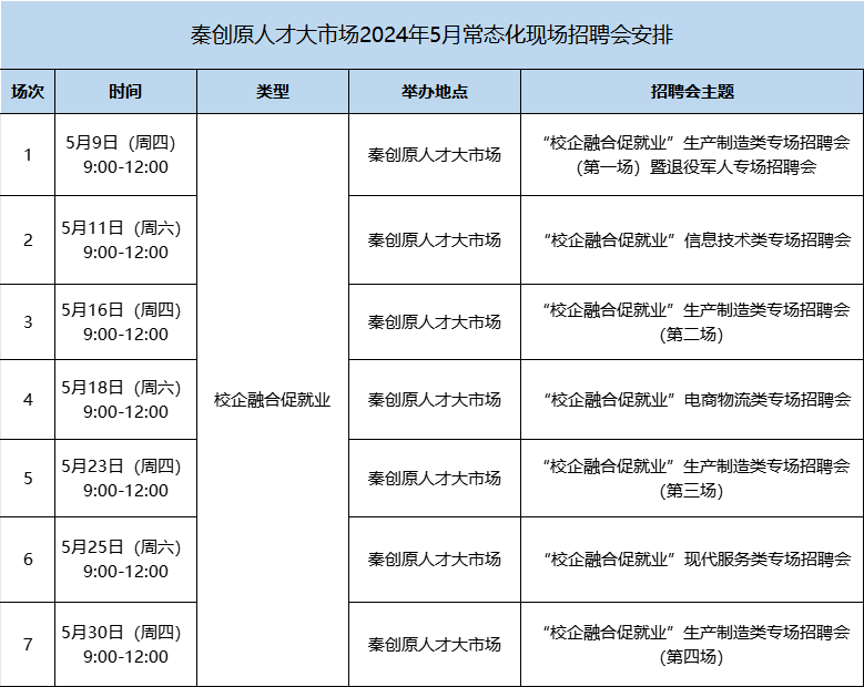 5月,秦创原人才大市场将举办7场不同主题现场招聘会,满足各企事业单位和广大求职者双选需求,具体安排如下。