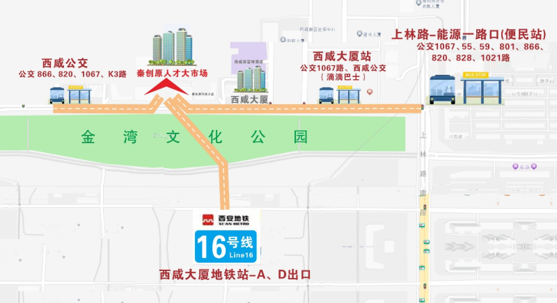 方式一:西安地铁16号线“西咸大厦”站A/D口出,步行至“西咸大厦”楼宇西侧100米即到