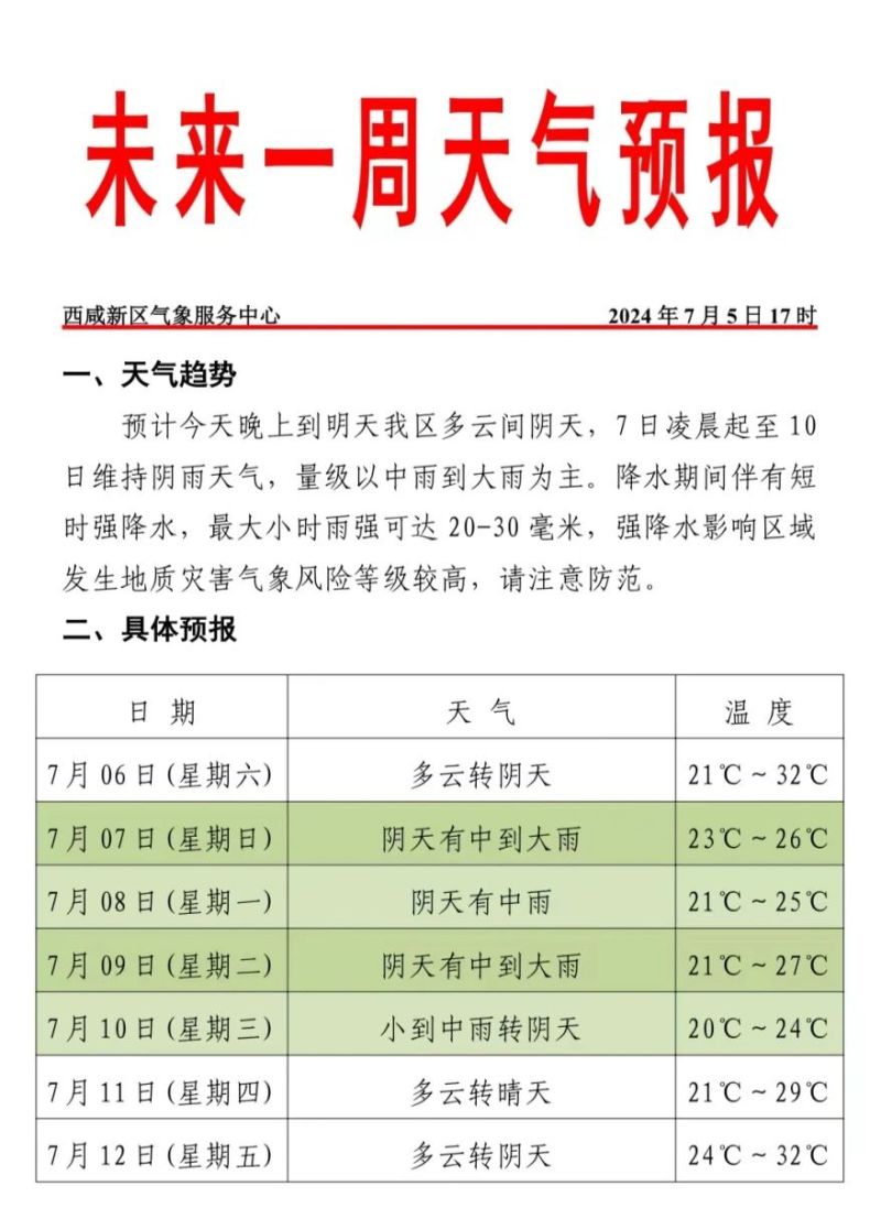 西咸新区气象服务中心2024年7月5日17时发布天气预报:预计今天晚上到明天新区多云间阴天,7日凌晨起至10日维持阴雨天气,量级以中雨到大雨为主。降水期间伴有短时强降水,最大小时雨强可达20-30毫米,强降水影响区域发生地质灾害气象风险等级较高,请注意防范。