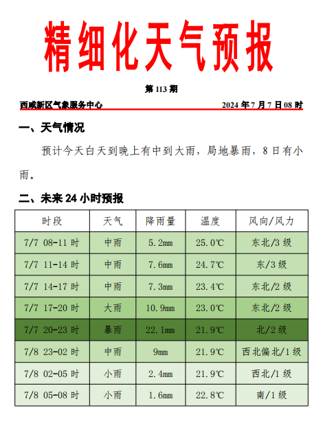 西安市气象台2024年7月7日10时48分发布暴雨蓝色预警信号:预计7日15时至8日05时西咸新区的大部分地方累积降雨量将达50毫米以上,其余地方累积降水量将达20~40毫米,降水期间伴有短时强降水、雷暴和短时大风,请注意防范。