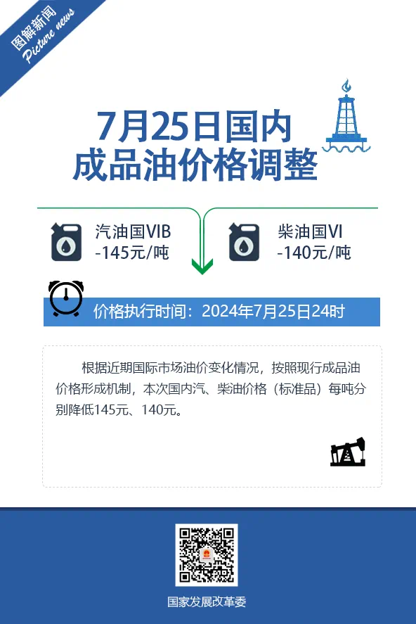 国家发展改革委发布消息,根据近期国际市场油价变化情况,按照现行成品油价格形成机制,自2024年7月25日24时起,国内汽、柴油价格每吨分别降低145元、140元。