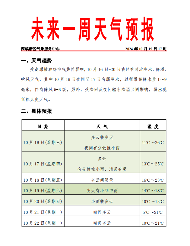 受高原槽和冷空气共同影响,10月16日-20日新区有两次降水、降温、吹风天气,其中10月16日夜间至17日有弱降水,伴有阵风5-6级;10月19日至20日有小到中雨,日平均气温下降8℃~10℃左右,局地12℃以上,并伴有6-7级阵风。另外,受降雨及夜间辐射降温共同影响,易出现低能见度天气。