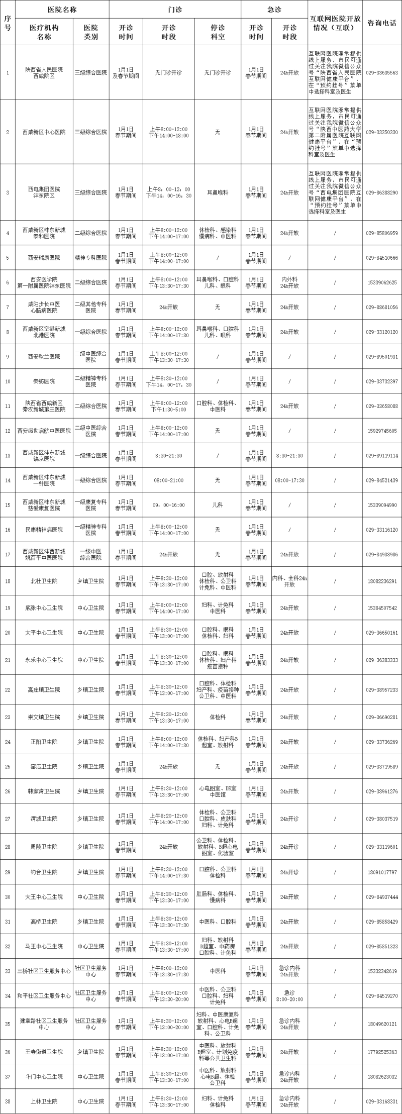 2025年西咸新区医疗机构元旦/春节期间门诊开诊信息