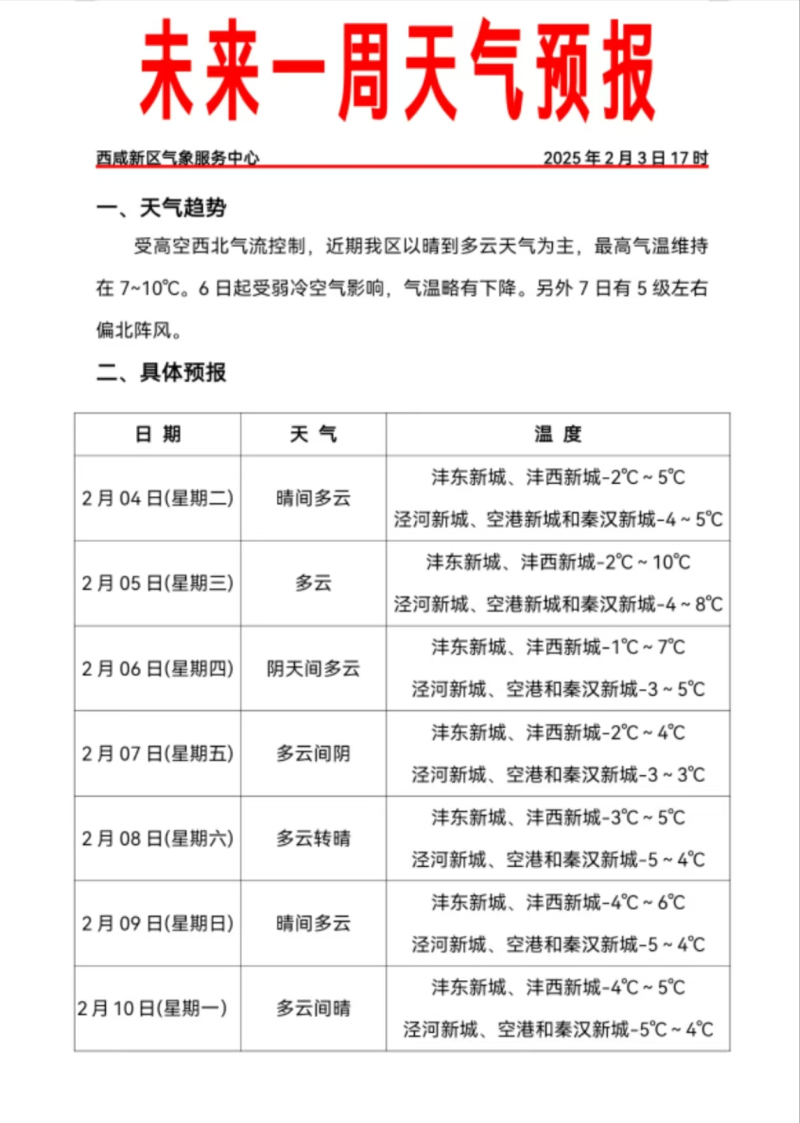 今天晚上到5日白天:晴间多云,沣东新城、沣西新城-2℃~10℃,泾河新城、空港新城和秦汉新城-4℃~8℃。