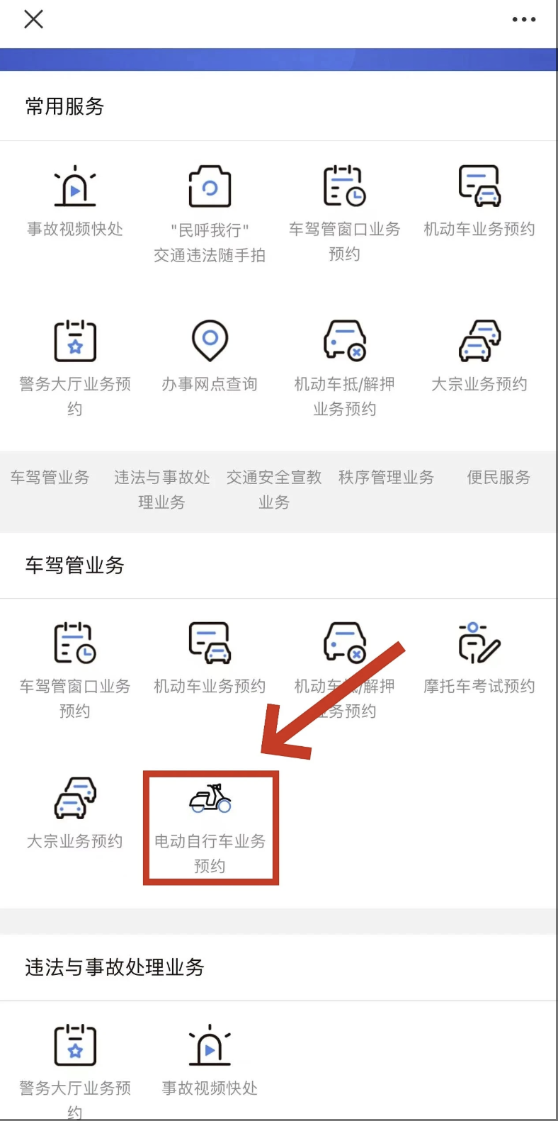 第一步:关注“西安交警”微信公众号,点击“业务办理”,随后点击“电动自行车业务预约”,按照流程填写相关信息,选择合适的挂牌地点进行预约。