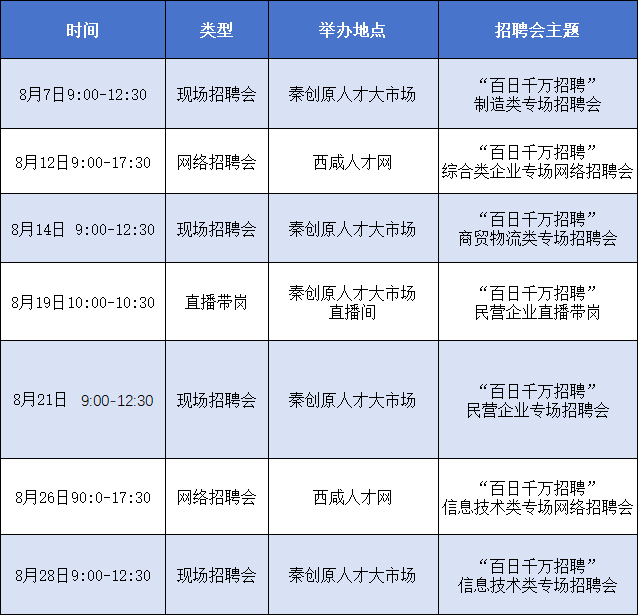 8月份,秦创原人才大市场将举办多场不同主题类型促就业活动,满足各企事业单位和广大求职者双选需求。