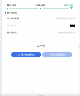 5.准确填写本人银行信息,包括开户行名称、银行户名及银行账号。填写完成后进行生育津贴或产前检查申报。