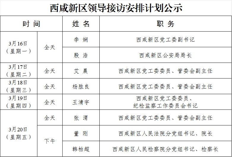 西咸新区领导接访安排计划公示(3月16日-20日)