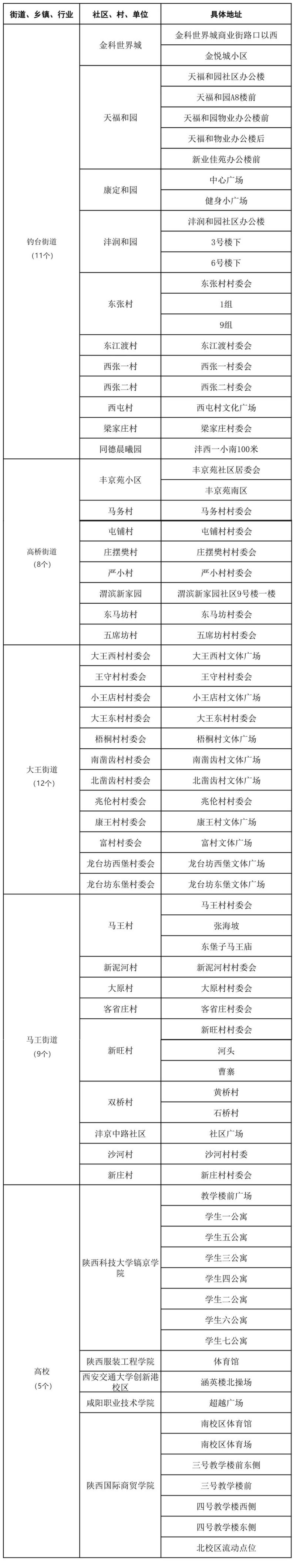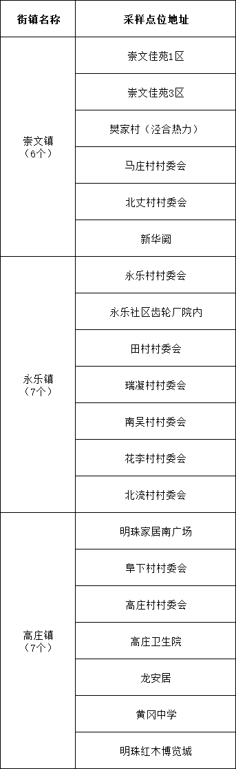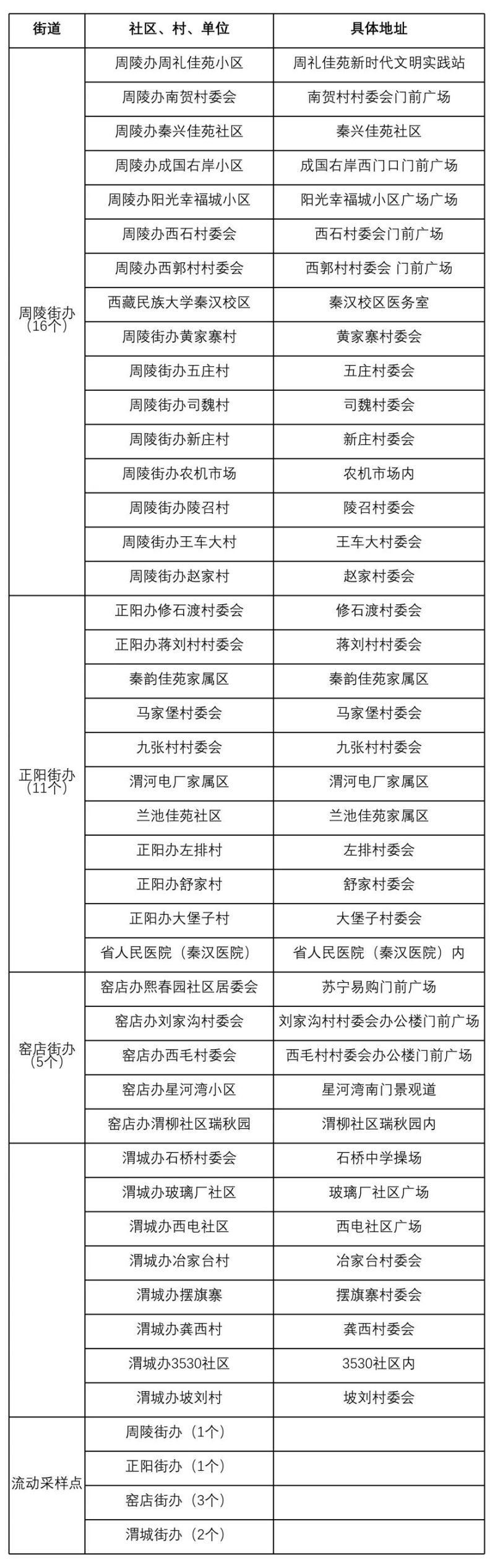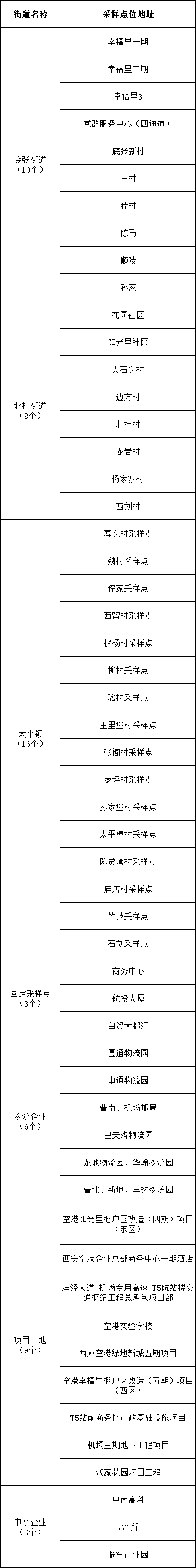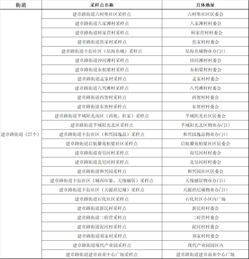 核酸检测采样点及具体时间安排以各街道办事处、社区(村)、单位通知为准,根据检测需求可能进行调整,请居民群众留意街道、社区(村)通知,或拨打新区咨询服务电话了解最新采样点信息。具体地点详见后附表格。