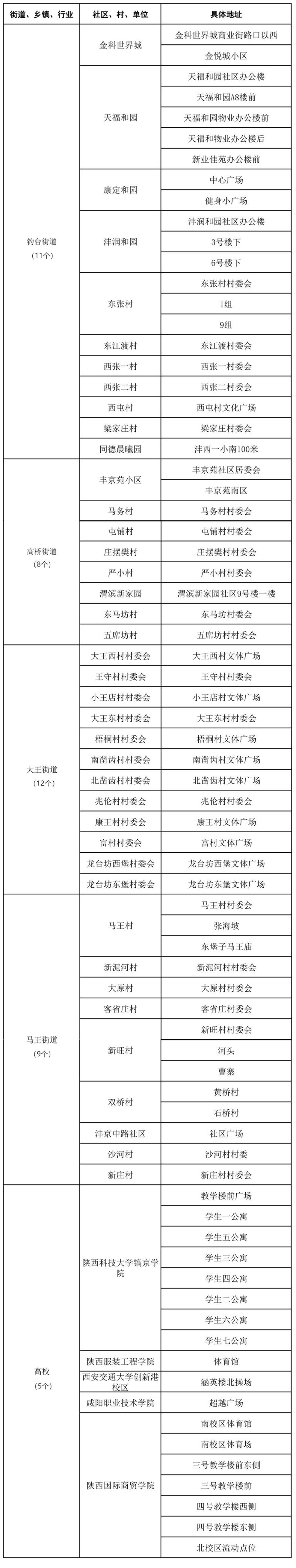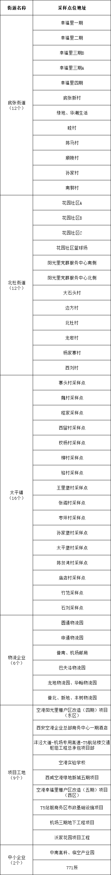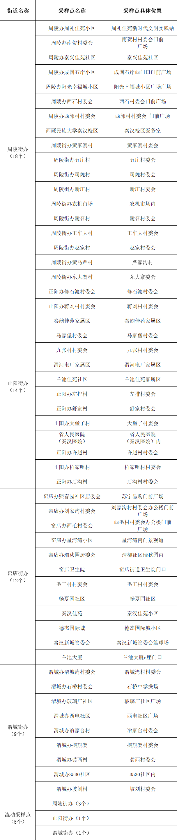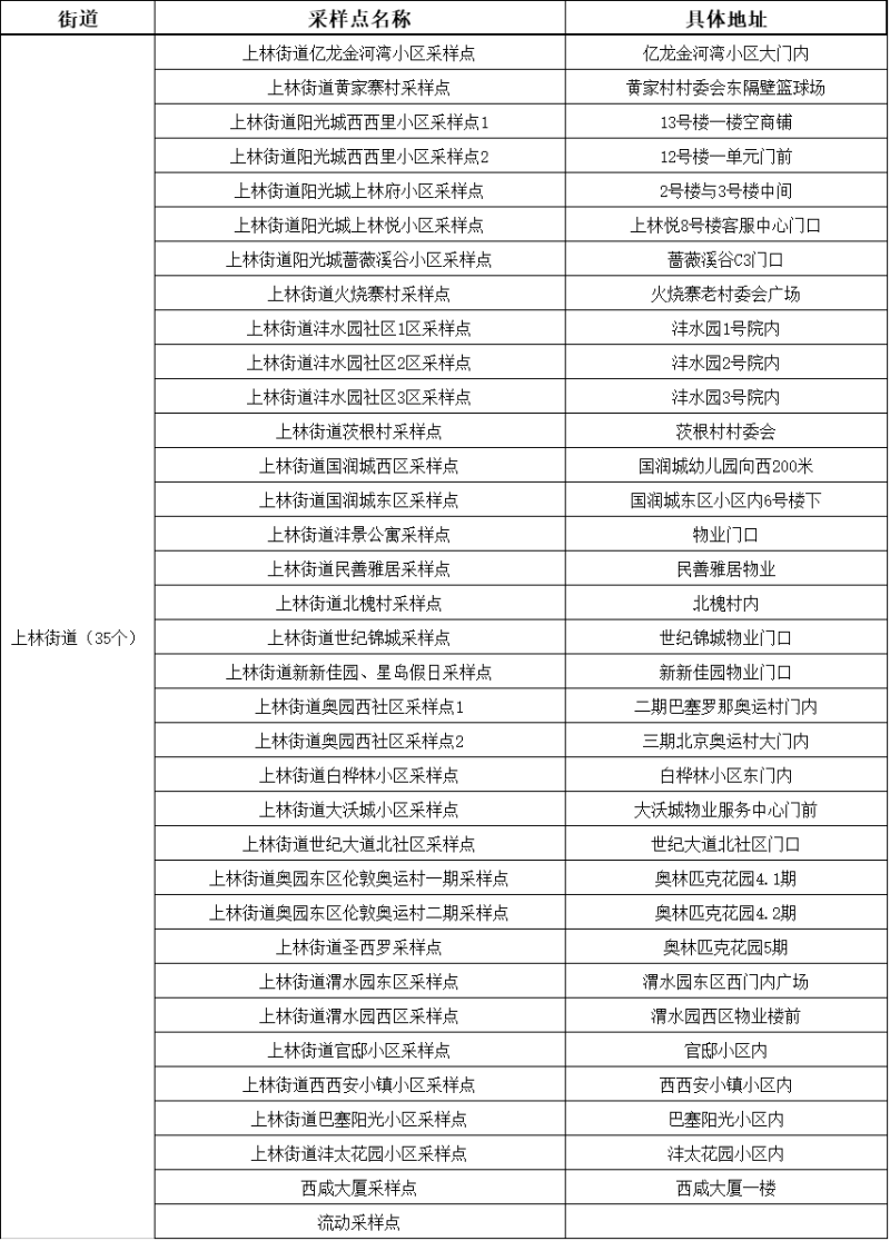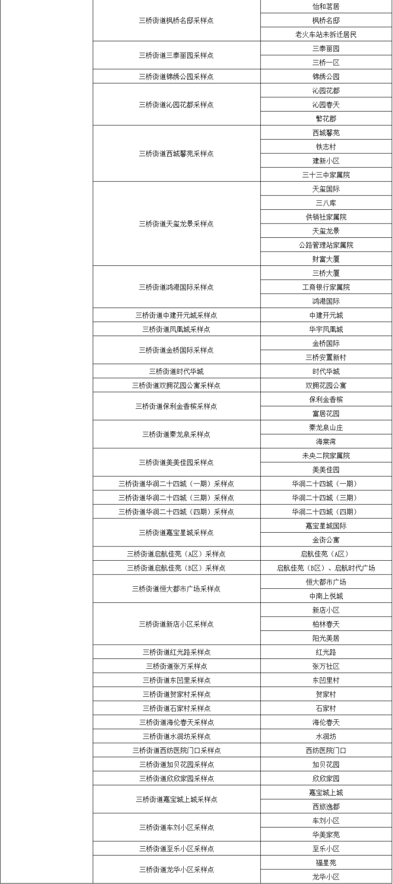 核酸检测采样点及具体时间安排以各街道办事处、社区(村)、单位通知为准,根据检测需求可能进行调整,请居民群众留意街道、社区(村)通知,或拨打新区咨询服务电话了解最新采样点信息。具体地点详见后附表格。