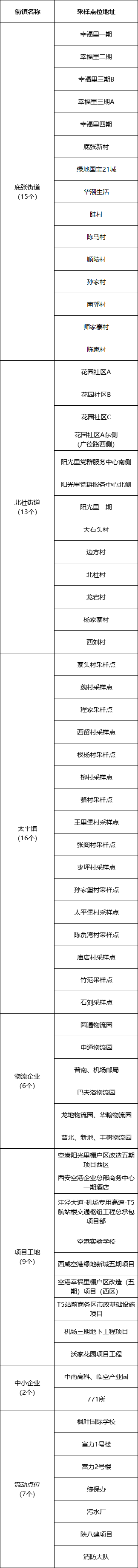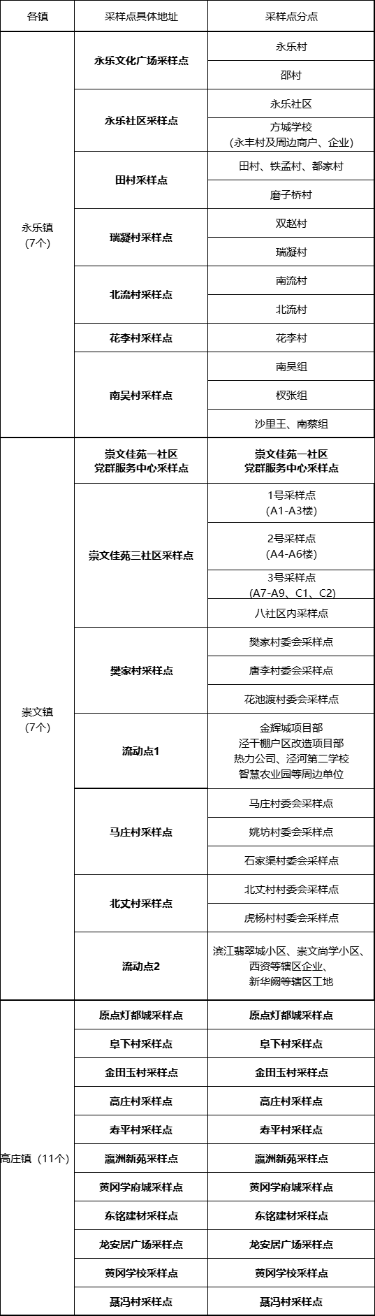 核酸检测采样点及具体时间安排以各街道办事处、社区(村)、单位通知为准,根据检测需求可能进行调整,请居民群众留意街道、社区(村)通知,或拨打新区咨询服务电话了解最新采样点信息。具体地点详见后附表格。
