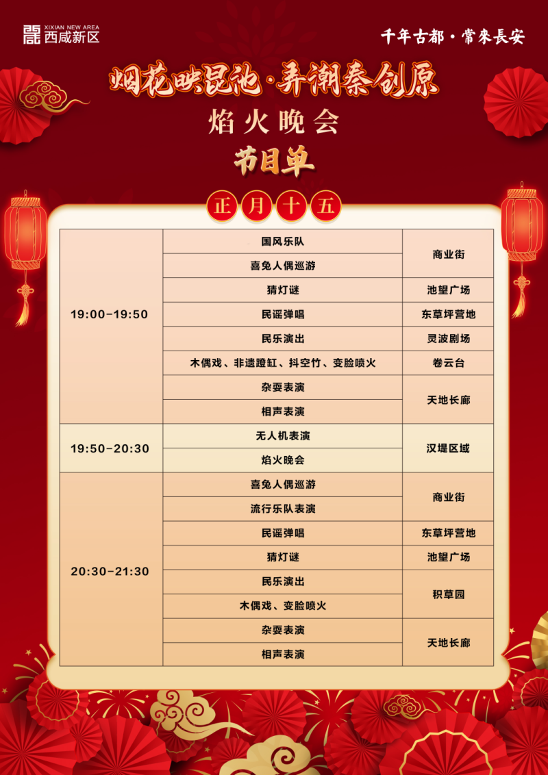 除了焰火晚会,元宵节当天,昆明池·七夕公园还将开展杂耍表演、人偶巡游、民谣弹唱、猜灯谜等各类形式丰富、内容精彩的民俗文化活动,欢迎大家前往参与观看。