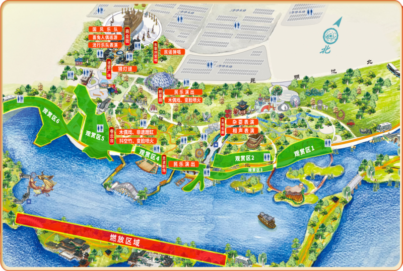 此次焰火晚会设置集中燃放区域,区域内(除工作人员和应急车辆外)禁止一切人员和车辆出入。同时设置集中燃放警戒区,具体划定范围区域为:昆明池•七夕公园汉堤鸾凤桥至思贤桥全段。