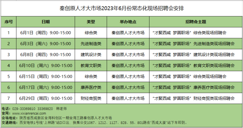 为深入贯彻党的二十大精神,落实全市八个方面重点工作任务,扎实做好稳就业、保就业、促就业工作,为企业事业单位和广大求职者搭建双选平台。西咸新区人力资源服务中心将在六月份举办7场不同主题类型现场招聘会,具体安排如下: