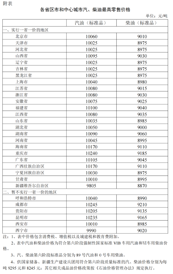 根据近期国际市场油价变化情况,按照现行成品油价格形成机制,自2023年8月9日24时起,国内汽、柴油价格(标准品,下同)每吨分别提高240元、230元。调整后,各省(区、市)和中心城市汽、柴油最高零售价格见附表。相关价格联动及补贴政策按现行规定执行。