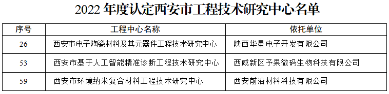 日前,西安市科学技术局公布了2022年度西安市工程技术研究中心认定名单,西咸新区秦汉新城企业陕西华星电子开发有限公司、西咸新区予果微码生物科技有限公司、西安前沿材料科技有限公司3家企业入选。