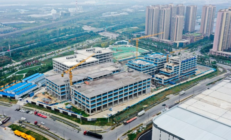 正在建设的项目一期,建筑面积约20.6万平方米,共有8栋建筑单体,主要建设科研办公楼、工业研发楼及配套设施。目前,项目8栋建筑主体均已封顶,正在进行内部二次结构及各项专业交叉施工。预计2025年全面建成运营,建成投产后预计年产值超过百亿元。